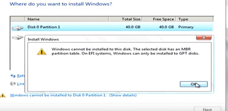 Windows cannot be installed to the disk. The selected disk has an MBR partition table. On EFI system, Windows can only be installed to GPT disk.